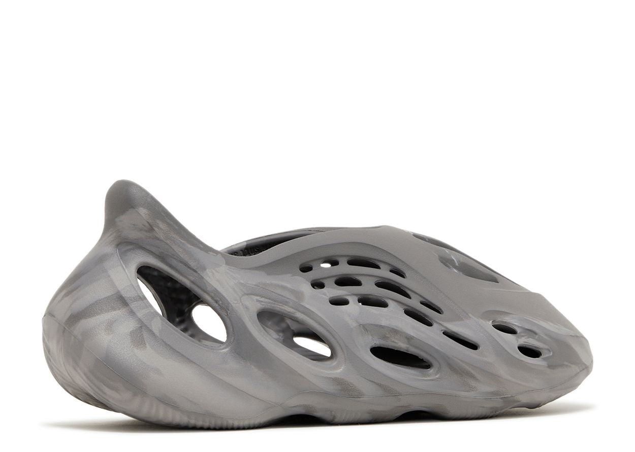 The Yeezy Foam Runner 'MX Granite' is crafted from durable EVA foam in a one-piece design with a marbled grey pattern. Sculpted lines and strategically placed vents enhance airflow, while a contoured heel and textured footbed provide comfort. A wavy outsole ensures traction.